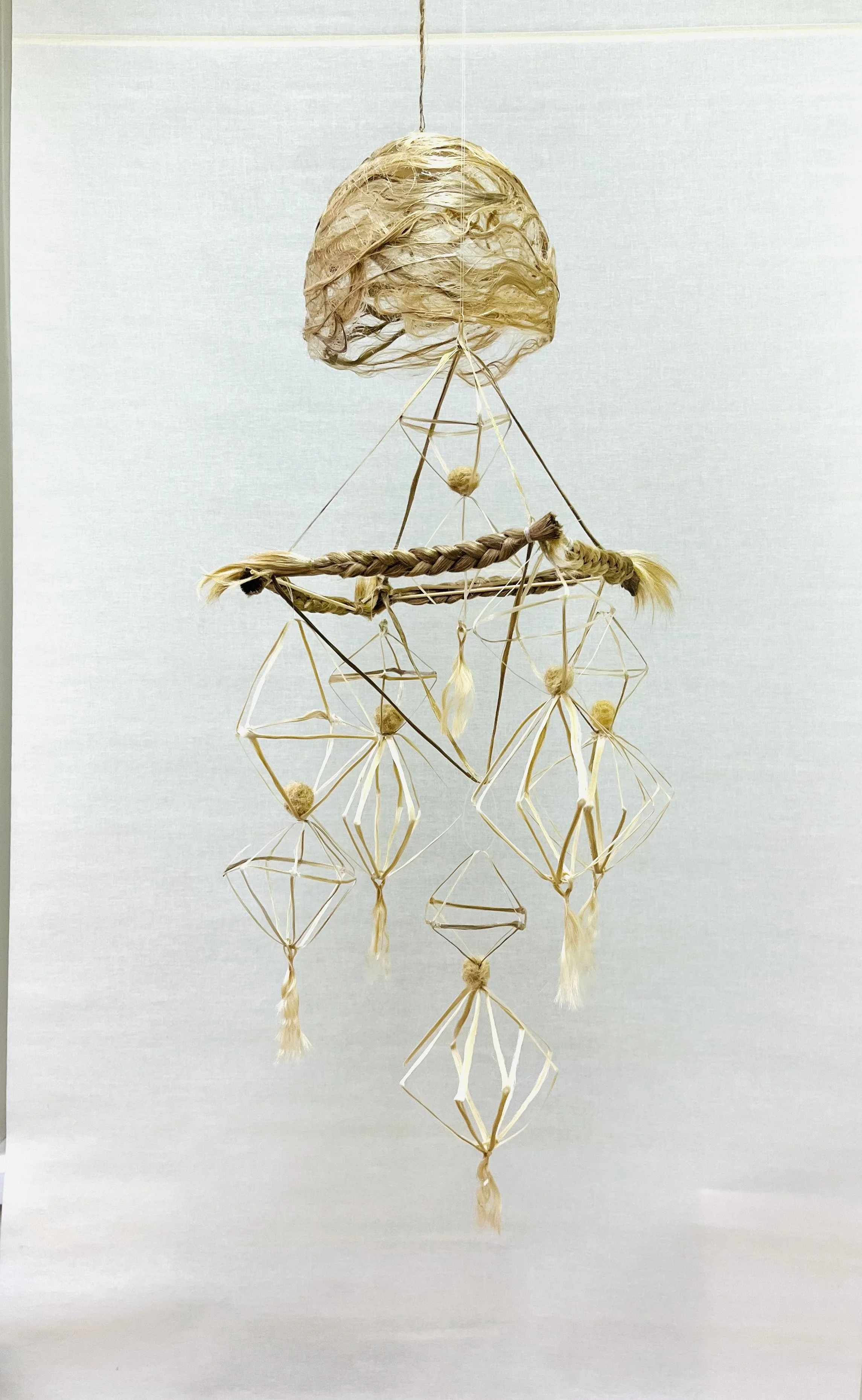 Why I choose to shape the strands into a himmeli the traditional Finnish decoratio. I have a personal touch to Himmeli since my childhood is has been a handcraft respected in my family.Himmeli carries a sense of lightness and history, many extension hair fibers i get are wheat blond like the wheat fibers used it Himmeli. My version takes the form of a diamond, a shape that for me symbolizes gold, value, and all the quiet blessings the fibers have gathered throughout their long journey from India to Finland.